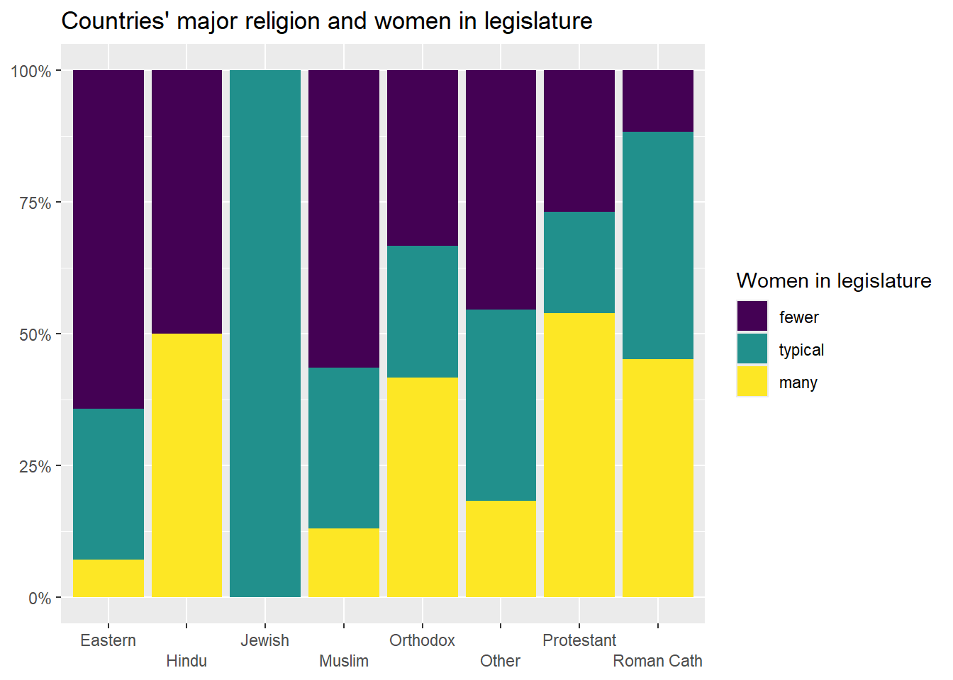 Take a look at that table. You can see that there are some pretty noticeable differences in female representation across states with different major religions. For example, the religion with the largest percentage of states with many women in their legislatures is Protestantism, with 53.85%, followed by Roman Catholicism, with 45.1%. To help us visualize these differences, we can generate a stacked bar graph using the technique that we learned in section 5.2: