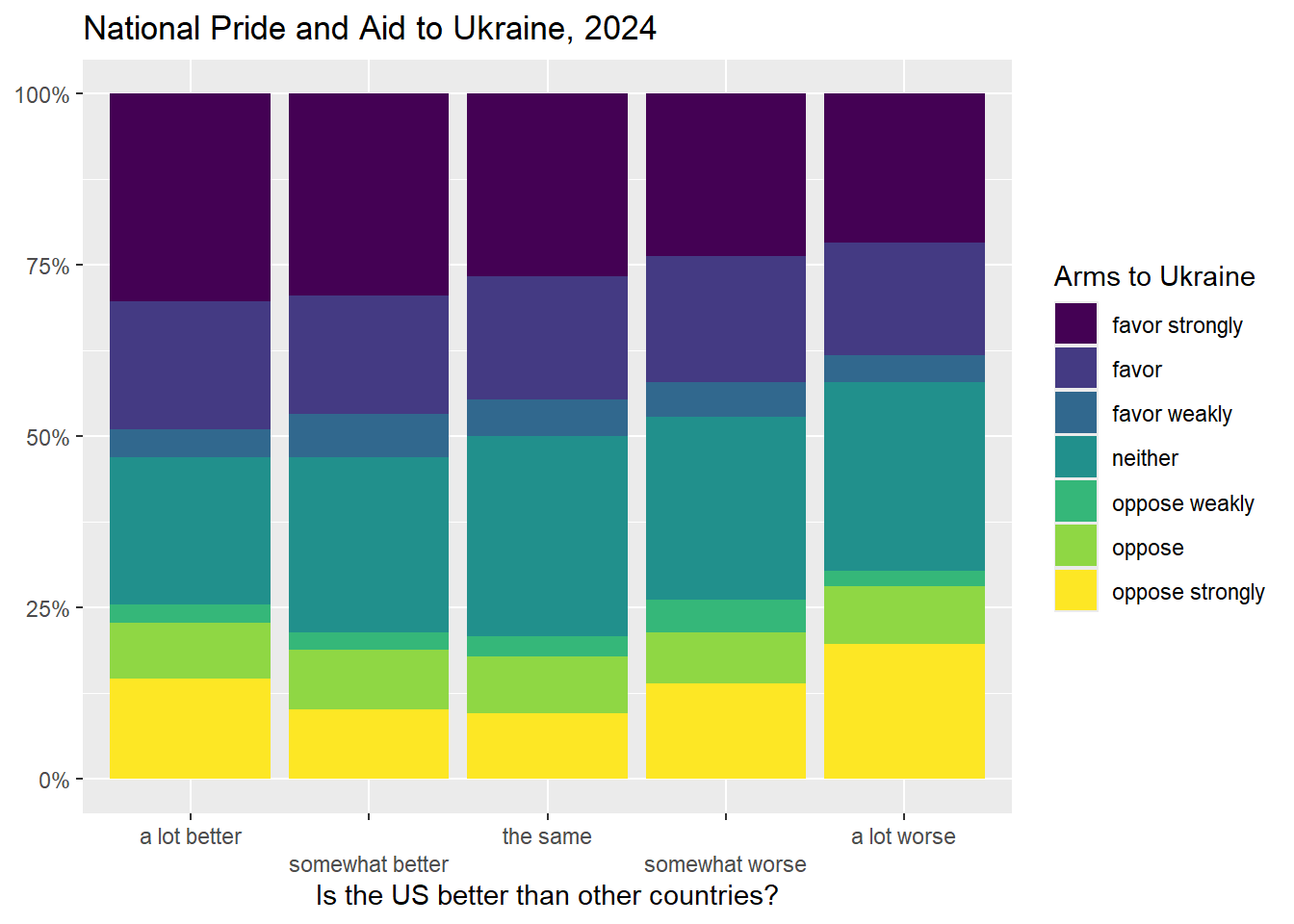Take a look at the above crosstab. The first column in that table tells us that, among those who believe that the US is a lot better than other countries, 30.31% strongly favor military aid to Ukraine, and 14.64% oppose military aide to Ukraine strongly. However, the last column shows us thatm among those to think that the US is a lot worst than other countries, 21.67% strongly favor military aid to Ukraine, and 19.7% oppose. That seems like a piece of evidence for our theory!