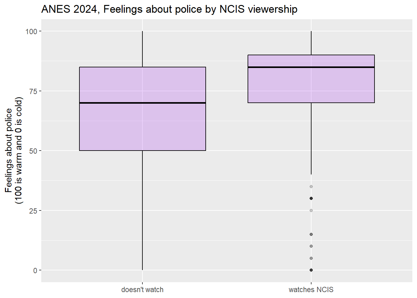 This graph shows us that the feeling thermometer scores for the police seem to have ranged from 0 to 100 for both NCIS viewers and non-viewers. However, the median score for non-NCIS watchers appears to be right around the first quartile for NCIS watchers. This graph does suggest that, overall, NCIS watchers seem to like the police more than non-watchers.