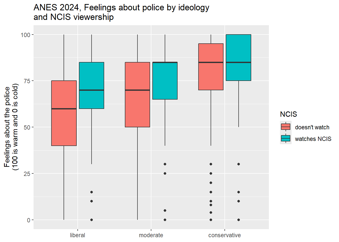 This boxplot clearly shows how the relationship between NCIS viewership and feelings about the police is stronger for liberals than it was for conservatives. This is a really nice example of an interaction, and it suggests that NCIS viewership may have had different meanings for liberals, moderates, and conservatives.